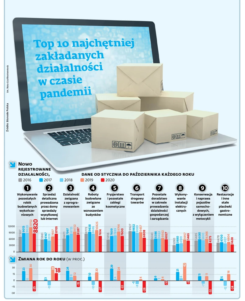 Przedsiębiorcy masowo inwestują więc w sklepy internetowe. – W tym roku powstało ich 8,7 tys., co stawia ten biznes na pozycji wicelidera najchętniej uruchamianych działalności – informuje Tomasz Starzyk, analityk. Ta działalność rok do roku zanotowała wzrost o 17,5 proc. Ale wzrost jest też w branży zarządzania nieruchomościami – o 35 proc. z 2,5 tys. w 2019 r. do 3,4 tys. w 2020 r. oraz wytwarzania energii elektrycznej (głównie montaż paneli słonecznych). Ale te dwie ostatnie znalazły się poza zestawieniem Top 10.