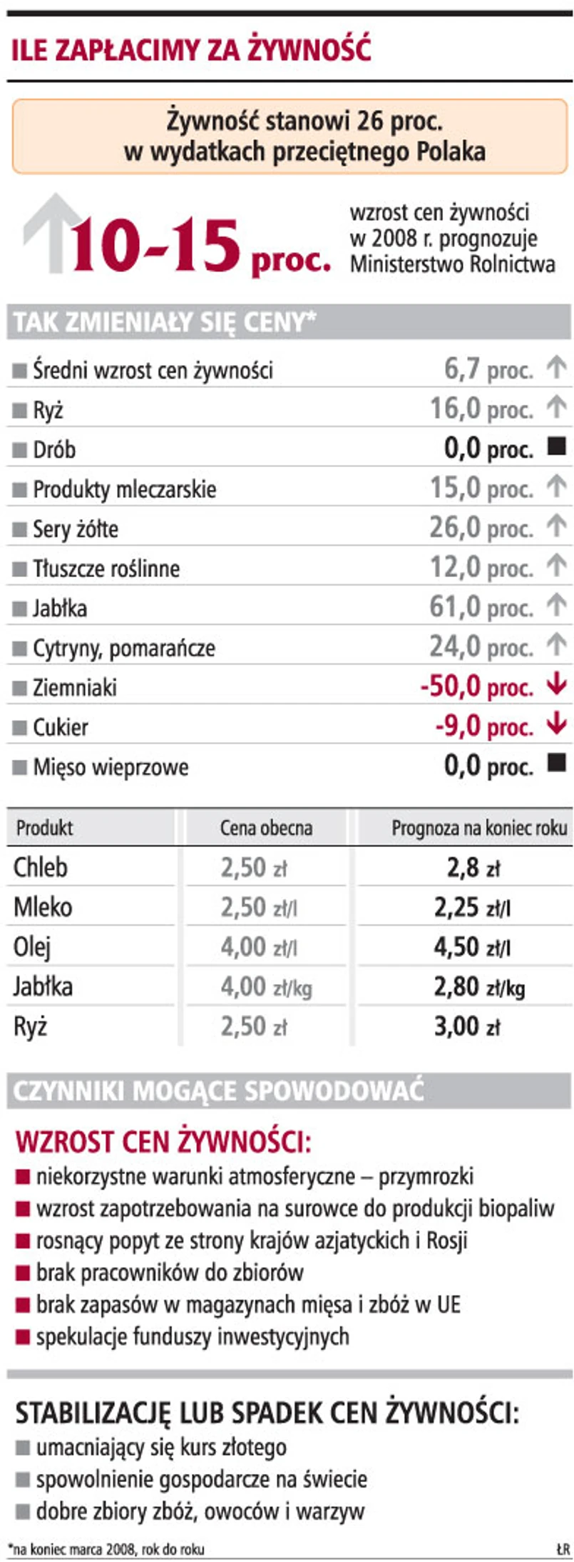 Amerykański Departament Rolnictwa szacuje, że na koniec czerwca światowe zapasy zbóż zmniejszą się do 109,7 mln ton, czyli o 12 proc. Już w tej chwili te zapasy są najmniejsze od 30 lat. W latach 2006-2007 ceny podstawowych 10 surowców rolniczych wzrosły o 33 proc. Jednocześnie stale rośnie konsumpcja w krajach azjatyckich, takich jak Chiny, Indie, Wietnam, a także w Rosji. Niektóre kraje arabskie (Syria, Egipt i Maroko) podjęły decyzje o gromadzeniu zapasów żywności. Wietnam, Chiny, Indie i Japonia wprowadziły ograniczenia w eksporcie ryżu. Na to nałożyły się spekulacje funduszy inwestycyjnych, które na większą skalę zaczęły spekulować na rynku spożywczym, podbijając ceny.