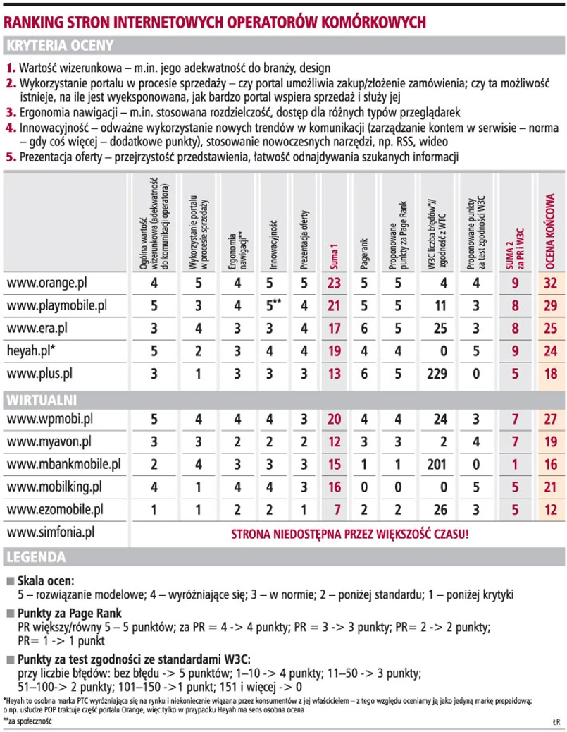 W rankingu oceniliśmy zarówno strony www operatorów tradycyjnych, jak i coraz większej liczby operatorów wirtualnych. Zwyciężył Orange, którego strona zdobyła najwięcej - 32 punkty, otrzymując najwyższe noty w większości kategorii.