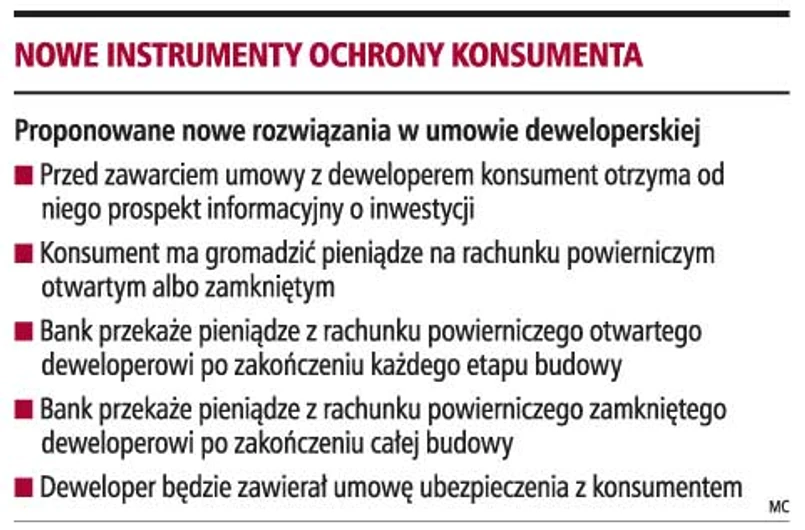 Przygotowywany projekt ustawy o umowach deweloperskich zapewniać ma ochronę interesów konsumentów za pomocą instytucji rachunku powierniczego: otwartego albo zamkniętego prowadzonego przez bank. Konsument gromadziłby na nim pieniądze przeznaczone na inwestycję, zamiast wpłacać je od razu na rachunek dewelopera. Z rachunku otwartego środki byłyby uwalniane w trakcie budowy, a bank przed dokonaniem kolejnej transzy wypłaty sprawdzałby, czy opisany w umowie deweloperskiej etap prac został już rzeczywiście zakończony. Natomiast na rachunku zamkniętym pieniądze czekałyby aż do momentu, w którym zostanie przeniesiona własność mieszkania na nabywcę.