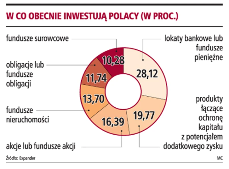 Polacy, którzy wciąż jeszcze boleśnie odczuwają giełdową bessę, inwestują obecnie, wybierając instrumenty o stosunkowo niskim poziomie ryzyka. Prawie 60 proc. portfela przeciętnego Polaka stanowią więc lokaty bankowe, fundusze pieniężne, produkty z ochroną kapitału oraz obligacje i fundusze obligacji. Polscy inwestorzy wybierają także dość bezpieczne fundusze nieruchomości. Instrumenty najbardziej ryzykowne, czyli akcje i fundusze akcji, a także fundusze surowcowe, stanowią niespełna 27 proc. portfela.