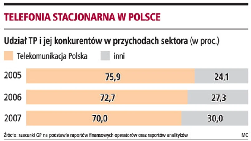 Według Telekomunikacji Polskiej, rynek telefonii stacjonarnej zmalał w I kwartale o 0,9 proc. w porównaniu z tym samym okresem 2007 roku. W tym samym czasie przychody TP, największego gracza w tym segmencie rynku telekomunikacyjnego, spadły o 3,7 proc. do 2 mld 645 mln zł. Oznacza to, że konkurenci TP zwiększyli swe przychody, a tym samym udział w rynku do ponad 30 proc.