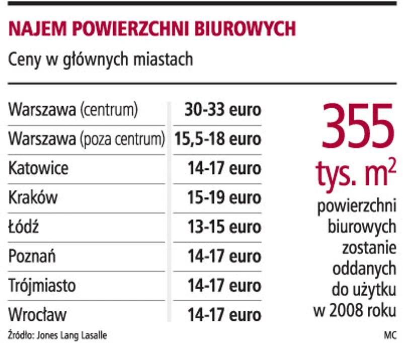 Popyt na powierzchnie biurowe rośnie u nas w tempie ok. 20 proc. rocznie. W 2008 roku powierzchnia biurowa w Polsce zwiększy się o 355 tys. mkw., jednak nie należy się spodziewać nadpodaży i spadku cen, bo większość powierzchni została już wynajęta z góry.