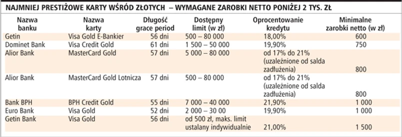 Kiedyś symbolem prestiżu były złote karty, które banki dawały najlepszym klientom. Obecnie za prawdziwie prestiżowe można jednak uznać karty platynowe. Kartę Gold może uzyskać nawet osoba zarabiająca poniżej 1 tys. zł netto. Aby uzyskać złotą kartę w Getin Banku, wystarczy bowiem miesięczny dochód na poziomie 600 zł, w Dominet Banku - 750 zł, a w Aliorze - 800 zł. W rezultacie obecnie prawie każdy może poczuć się jak milioner, pod warunkiem że jest gotów zapłacić kilkaset złotych za korzystanie z karty.