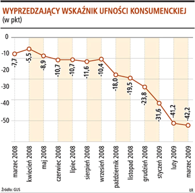 Jeszcze gorzej wygląda indeks wyprzedzający, który pokazuje, jak może kształtować się konsumpcja prywatna w następnych miesiącach. Wyniósł on -42,2 pkt. To najmniej od 2003 roku.