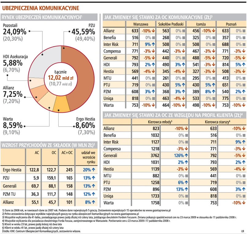 Stosowane obecnie stawki porównaliśmy ze stosowanymi w październiku ubiegłego roku. Towarzystwa uwolnione od ciężaru tzw. podatku Religi, czyli 12 proc. opłaty od każdej polisy OC, zaczęły mocniej konkurować ceną. Zniżki w podobnej skali, czyli 5-10 proc., widać też w pakietach OC i AC komunikacyjnego. Towarzystwa coraz bardziej różnicują stawki. Opłaca się porównywanie kilku ofert przed zawarciem umowy, bo oszczędności mogą sięgnąć kilkuset złotych, szczególnie w przypadku młodych kierowców.
