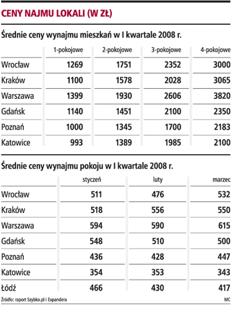 - Na warszawskim Żoliborzu i Białołęce ceny najmu kawalerek wzrosły w pierwszym kwartale tego roku o prawie 1/4. W tym samym czasie, na Targówku za najem płaci się o 17 proc. mniej - twierdzi Michał Wilczyński. Wyraźnie widać, że najemcy poszukują coraz lepszych lokalizacji i za te lokalizacje gotowi są nawet więcej zapłacić. Na rynku obserwuje się też wzrost popytu na duże mieszkania trzy-, czteropokojowe. To pokazuje, że rzeczywiście na najem decydują się osoby posiadające rodzinę, które czekają na okazję, by tanio kupić własną nieruchomość. Eksperci spodziewają się nawet nasilenia tego zjawiska w następnych miesiącach, wzrostu popytu na najem większych mieszkań.