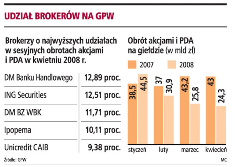 Drugi pod względem obrotów był ING Securities (w marcu miał największy udział w obrotach), w którym za większość obrotów realizowanych na rynku akcji również odpowiedzialni są klienci instytucjonalni. Za nim uplasował się DM BZ WBK oraz Ipopema Securities, który w styczniu, po nieco ponad roku od rozpoczęcia działalności, miał największy udział w obrotach akcjami. Sukces Ipopemy Securities to efekt działań zespołu, który zasilili byli pracownicy DM Banku Handlowego. Za nimi podążyli klienci. Firma obsługuje wyłącznie inwestorów instytucjonalnych krajowych i zagranicznych. W I kw. 2008 r. wśród jej klientów aktywne były przede wszystkim instytucje krajowe. Teraz dołącza zagranica.