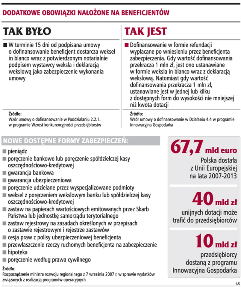 Sam weksel już nie wystarcza, by dostać dotację powyżej 1 mln zł, urząd zażąda innych zabezpieczeń, np. hipoteki. To ogranicza dostęp do unijnych funduszy słabszych finansowo beneficjentów, czyli mniejszych firm. Ministerstwo Rozwoju Regionalnego planuje jesienią zmienić niefortunne rozporządzenia.
