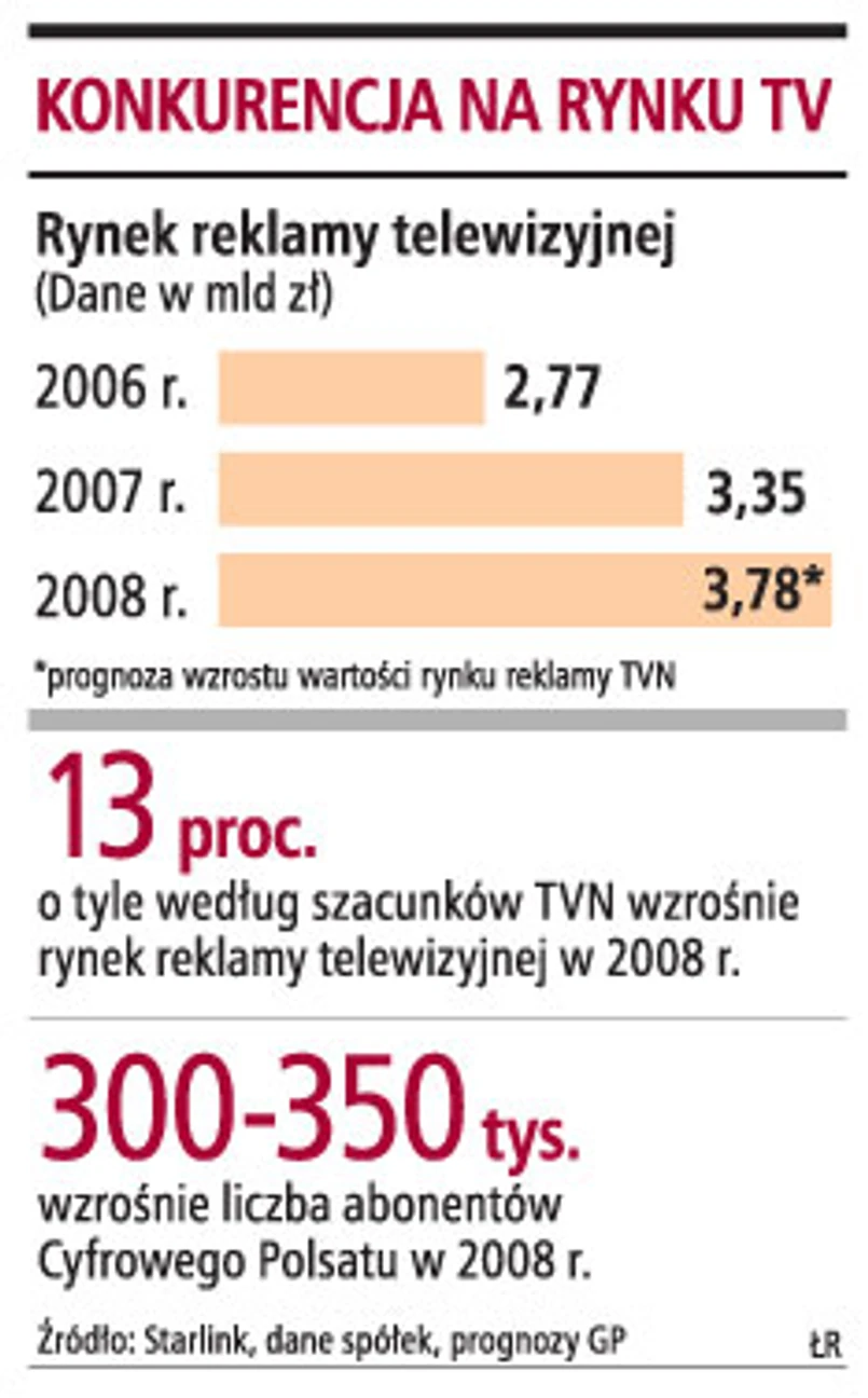 Koszty będą jednak nadal rosły. Rywalizacja platform cyfrowych o około 6 mln gospodarstw domowych, posiadających wciąż jedynie telewizję analogową, zaostrzy się za sprawą nowych graczy. Swoją platformę zbudować chce Telekomunikacja Polska i TVP. Ale nawet bez tego przyrost liczby abonentów będzie mniejszy. Dominik Libicki, prezes Cyfrowego Polsatu, przyznał wczoraj, że w tym roku przyrost liczby abonentów będzie mniejszy.