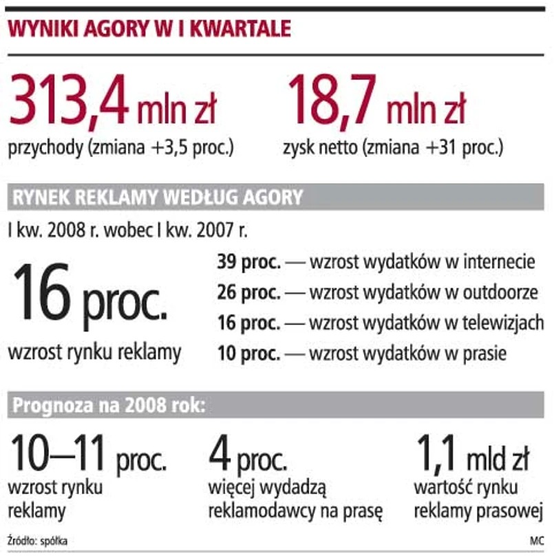 Mimo dobrych wyników za I kwartał inwestorzy byli zaniepokojeni i sprzedawali wczoraj akcje Agory. Powodem była transakcja przejęcia za 119,5 mln zł spółki Trader.com, uznana przez rynek za zbyt wysoką i wzbudzająca obawy, że Agora w przyszłości będzie przepłacać za inwestycje - wynika z analizy GP.