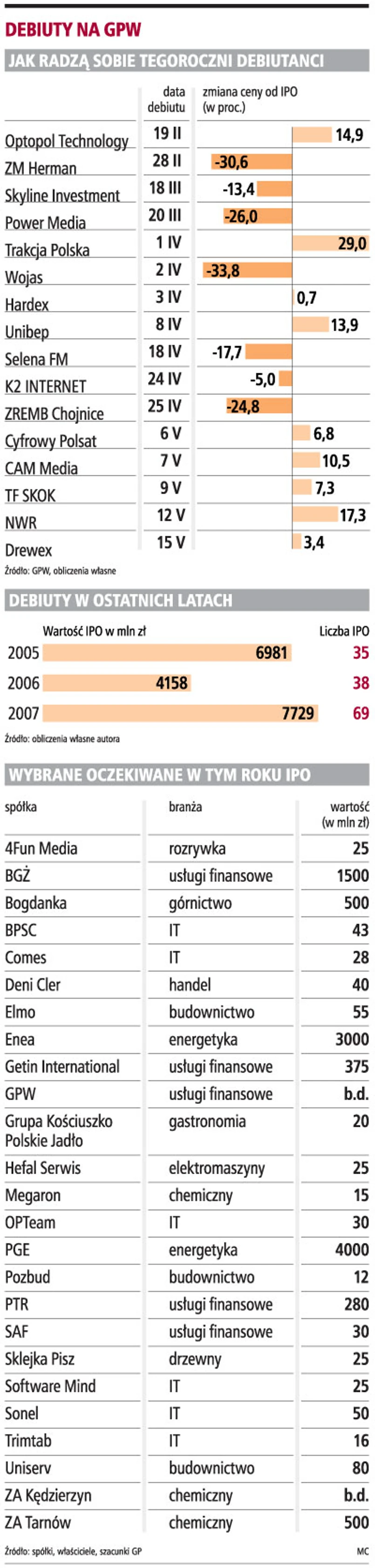 Choć na giełdzie trwa bessa, to już 17 firm przeprowadziło w tym roku pierwszą publiczną ofertę (IPO) i zadebiutowało na warszawskiej giełdzie (GPW). W IPO spółki i ich właściciele zebrali od inwestorów w sumie blisko 1,7 mld zł, z czego gros (839 mln) przypada na Cyfrowy Polsat. Akcje znacznej części tegorocznych giełdowych debiutantów są dziś notowane poniżej ceny emisyjnej. Do wyjątków należą m.in. Optopol Technology i Trakcja Polska.