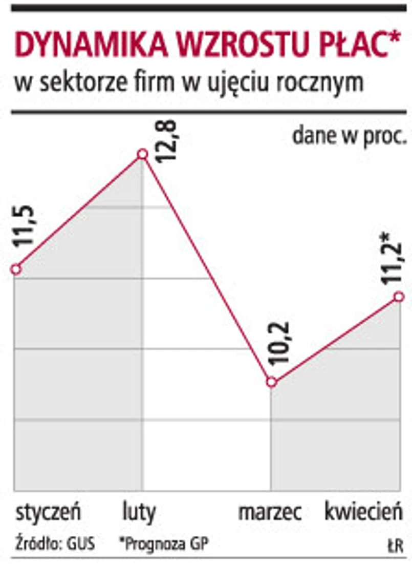 Z prognoz GP wynika, że płace w kwietniu wzrosły o 11,2 proc. po wzroście o 10,2 proc. w marcu. Ekonomiści mówią, że na rynku pracy nie widać zmian, które niosłyby ze sobą możliwość spadku dynamiki płac.