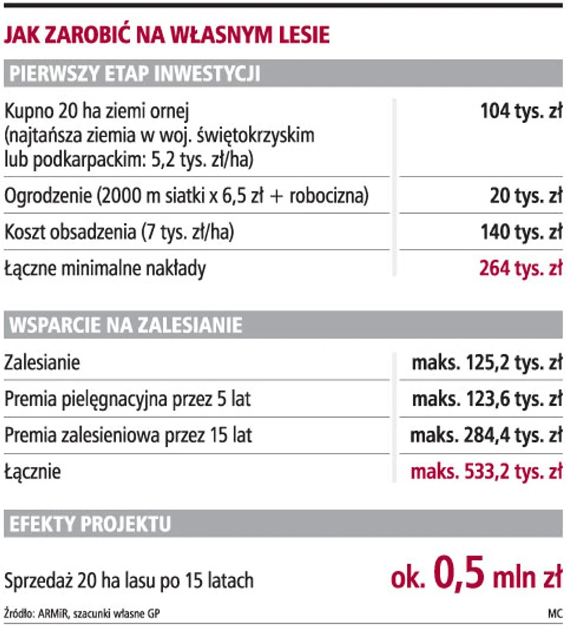 Nie trzeba jednak wykładać własnych pieniędzy, bo można otrzymać wsparcie na zalesianie. Zdaniem specjalistów obsadzenie 1 hektara kosztuje ok. 7 tys. zł. Najwięcej pieniędzy można uzyskać obsiewając tereny wyżynne, gdzie nachylenie stoku przekracza 12 proc. Warto też zasadzić drzewa iglaste i całą uprawę ogrodzić. Przez kolejne pięć lat będzie można otrzymywać premię pielęgnacyjną za opiekę nad uprawą, a także pobierać premię zalesieniową jako równoważność utraconych dochodów z powodu przekształcenia gruntów rolnych w leśne. Po tym okresie właściciel może w zasadzie zrobić z lasem co chce. Sprzedaż lasu może przynieść średnio pół miliona złotych. Opłaca się też sprzedaż drewna.