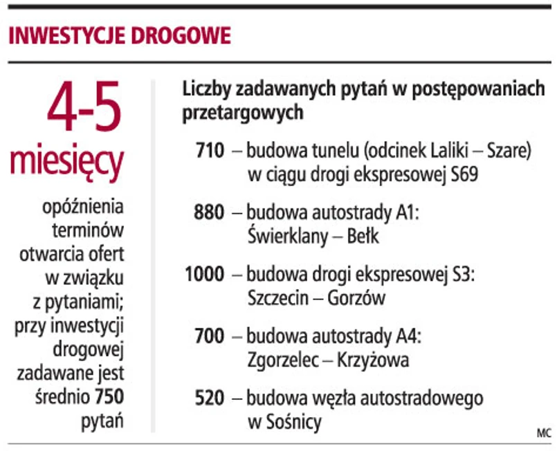 - Przy inwestycjach drogowych zadawanych jest około 700 - 800 pytań. Wydłuża to termin otwarcia ofert o około czterech-pięciu miesięcy - wskazuje Andrzej Maciejewski, rzecznik prasowy GDDKiA.