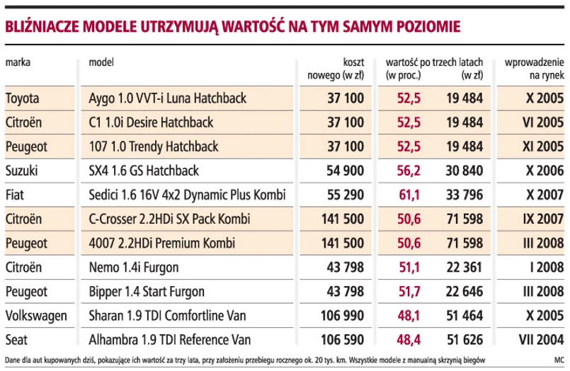 W przypadku bliźniaczych aut, czyli produkowanych w jednej fabryce, a sprzedawanych pod różnymi markami, marka wybieranego dziś pojazdu nie będzie miała istotnego znaczenia dla jego ceny przy sprzedaży na przykład po trzech latach.