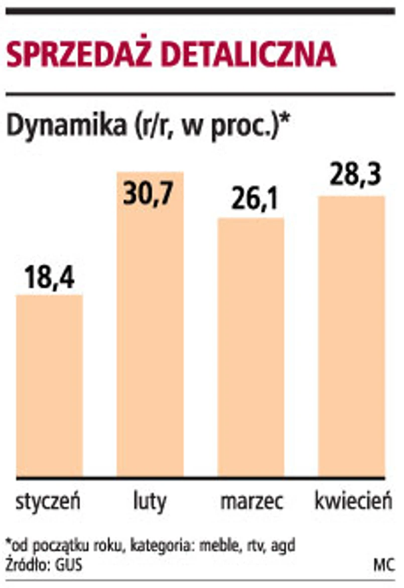 Po niewielkim spadku dynamiki w marcu (15,7 proc.) sprzedaż wzrosła w kwietniu o 17,6 proc. r/r.