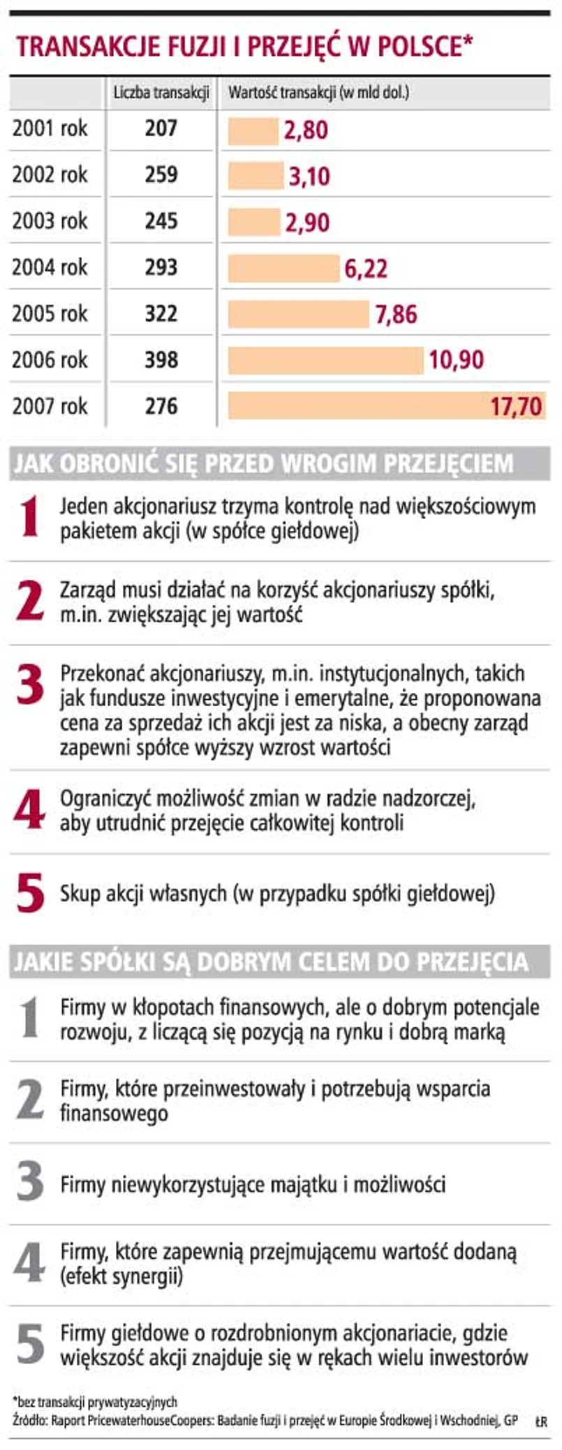 Jak mówi Michał Nowacki z Ernst & Young, na rynku publicznym, o ile nie mamy do czynienia z uzgodnionymi przez inwestorów i akcjonariuszy transakcjami, firmę może uchronić przed przejęciem przede wszystkim koncentracja w jednym ręku głosów zapewniających kontrolę nad przedsiębiorstwem.