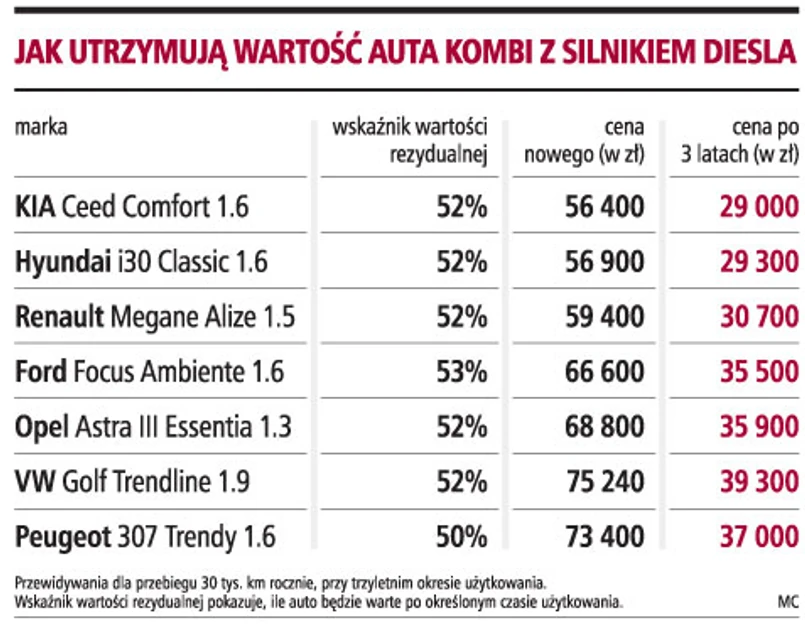 Jak wynika z zestawienia przygotowanego dla GP przez EurotaxGlass's, w segmencie aut klasy niższej średniej kombi z silnikami Diesla, porównywalne modele mają bardzo zbliżony wskaźnik wartości rezydualnej, w okolicach 52-53 proc. To oznacza, że wraz z upływem czasu ich cena na rynku nadal będzie porównywalna.