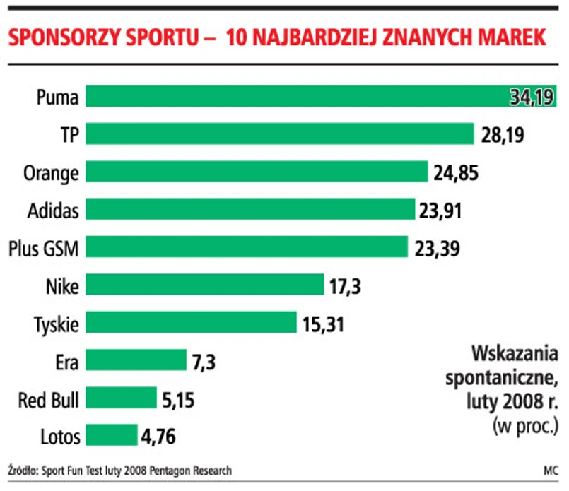Podobny cel ma Puma, także sponsor reprezentacji, wskazywana przez Polaków na pierwszym miejscu wśród sponsorów (częściej niż TP). Taki sposób zwiększania rozpoznawalności jednak kosztuje. I to coraz więcej. Kwota całego kontraktu sponsorskiego reprezentacji jest tajemnicą. Według naszych informacji, za obecny dwuletni kontrakt sponsorski reprezentacji TP zapłaciła około 12 mln zł. Za poprzedni - około 8 mln zł. Wojciech Jabczyński nie skomentował tych kwot.