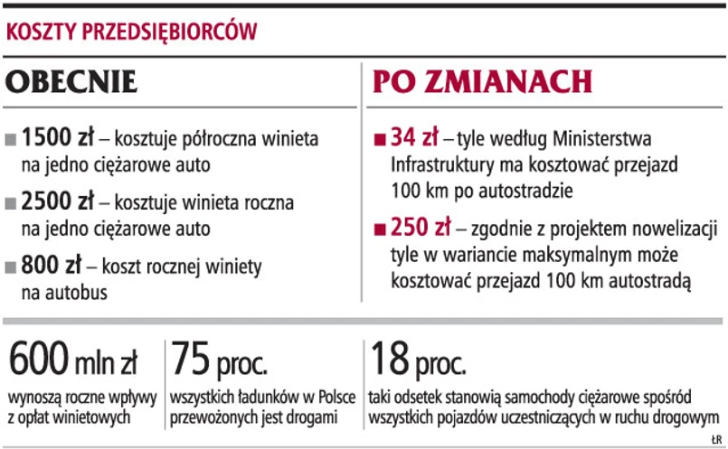 Obecnie kierowcy ciężarówek muszą kupować winiety, by móc poruszać się po polskich drogach i autostradach. Winiety są różne - mogą być dobowe, tygodniowe, półroczne czy też roczne. Przykładowo półroczna winieta na pojazd ciężarowy o masie 12 ton kosztuje do 1,5 tys. zł, a winieta roczna do 2,5 tys. zł. Natomiast po zmianach przejazd zaledwie 100-km autostradą może kosztować przedsiębiorcę 34 zł - w wariancie ocenianym przez resort infrastruktury. Jeżeli pojazd taki w ciągu roku pokona 30 tys. km, to koszt podróży wyniesie ponad 10 tys. zł.
