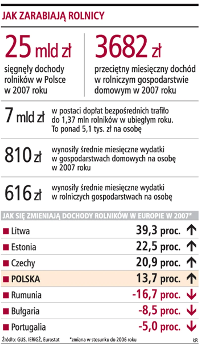 Dochody w polskich gospodarstwach rolnych rosną szybciej niż w innych gospodarstwach domowych. Przez kilka lat dochody będą się zwiększać o 6-7 proc. rocznie, tylko z UE do rolników trafi 13,7 mld euro. Rolnicy budują domy, kupują maszyny, zaczynają też wyjeżdżać na urlopy i korzystać z bankowości internetowej.