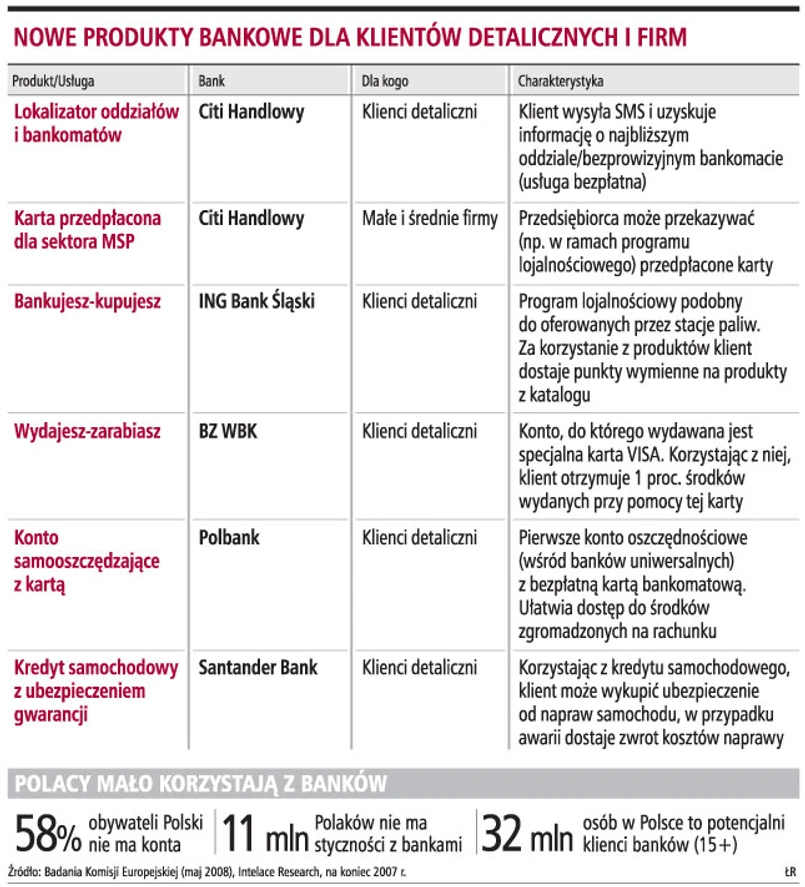 Bankowcy zaczynają też wreszcie coraz silniej skupiać uwagę na tworzeniu oferty dla małych i średnich przedsiębiorstw (MSP). W ostatnich miesiącach w wielu bankach przebudowano oferty dla tego sektora, kładąc nacisk szczególnie na przedsiębiorców rozpoczynających działalność. Stosowne pakiety produktowe zaoferowały m.in. duże banki, takie jak Pekao, PKO BP i Bank Zachodni WBK. W zestawieniu uwzględniliśmy produkt znany już klientom detalicznym, czyli kartę przedpłaconą, którą dla sektora MSP oferują Citi Handlowy i ING. Potencjał polskiego rynku bankowego dostrzegają także nowi gracze, którzy szykują w ciągu najbliższych miesięcy ekspansję na polski rynek. Pierwszy z nich to przedstawiciel włoskiej grupy Carlo Tassara - Alior Bank, dowodzony przez Wojciecha Sobieraja, który odpowiadał m.in. za rozwój bankowości detalicznej w BPH. Bank ma bardzo ambitne plany - w ciągu trzech lat chce mieć milion klientów i udział w rynku na poziomie 2-4 proc. O ofercie wiadomo na razie tyle, że będzie dość standardowa - dla klientów detalicznych kredyty, rachunki, produkty inwestycyjne oraz pion obsługujący przedsiębiorstwa. Prawdopodobnie na początku jesieni zacznie działalność także Allianz Bank, należąca do grupy Allianz, trzeciego ubezpieczyciela w Polsce. Bank będzie oferował produkty na początku przez sieć agentów ubezpieczeniowych - początkowo m.in. kredyty hipoteczne - ale do końca roku planuje otwarcie 70 placówek i 20 centrów hipotecznych.
