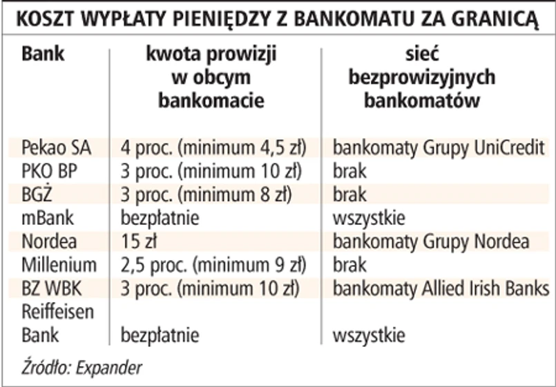 Jeśli korzystamy za granicą z bankomatów innych banków, to podobnie jak w kraju - trzeba za to zapłacić. Nasz bank pobiera prowizję, ale musi się nią podzielić z właścicielem bankomatu. Najczęściej prowizja określana jest procentowo (z tym, że mamy też kwotę minimalną, którą trzeba zapłacić nawet przy niewielkich transakcjach). Minimalna kwota wynosi to 4-10 złotych od transakcji (zależy od banku i bankomatu, z jakiego korzystaliśmy). Niektóre banki oferują możliwość korzystania z zagranicznych bankomatów za darmo. Najczęściej dotyczy to jedynie sieci, których właścicielem jest także udziałowiec polskiego banku (prowizji nie płacimy jednak dopiero przy wypłacie większej kwoty).