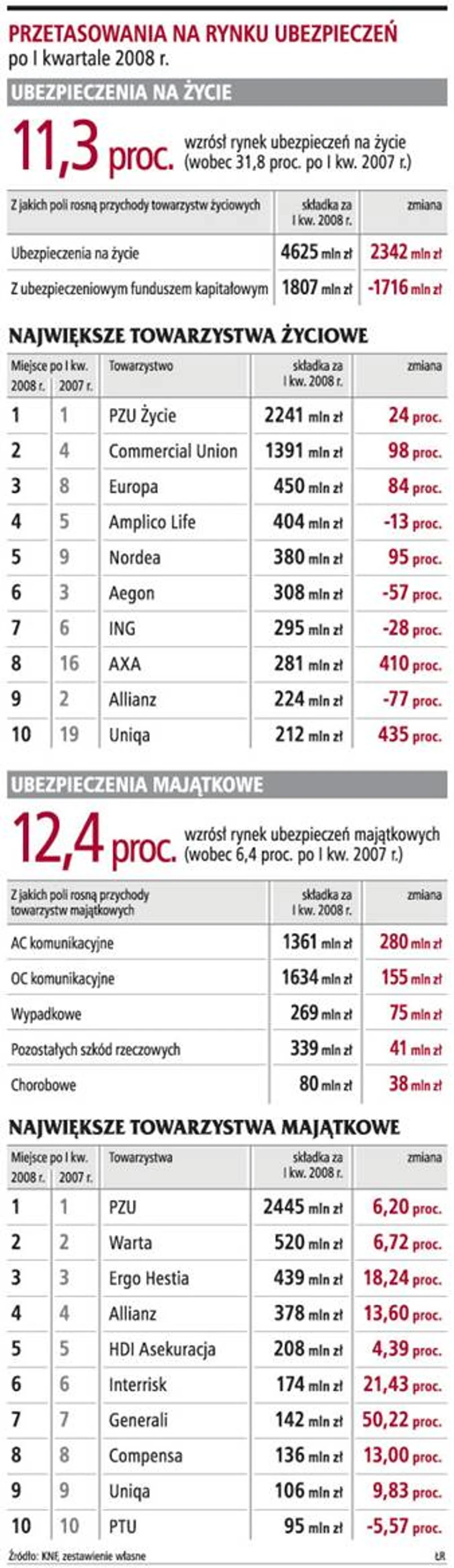 Po raz pierwszy od ponad 11 lat wzrost rynku ubezpieczeń majątkowych był wyższy (12,4 proc.) niż sprzedaży polis na życie (11,3 proc.) - wynika z danych Komisji Nadzoru Finansowego. To efekt złej koniunktury na giełdzie, która spowodowała, że przestaliśmy kupować życiowe polisy inwestycyjne ze składką jednorazową. W tego typu umowach inwestuje się w ubezpieczeniowe fundusze kapitałowe, z których większość nie daje gwarancji zysków. W I kwartale wydaliśmy na nie o ponad 1,7 mld zł mniej niż rok wcześniej. Najbardziej na tym trendzie stracili: Allianz (741 mln zł spadku przypisu) i Aegon (400 mln zł). Te firmy były w ubiegłym roku na 2. i 3. pozycji w rankingach zestawianych ze względu na przypis składki. Teraz mają znacznie gorsze pozycje.