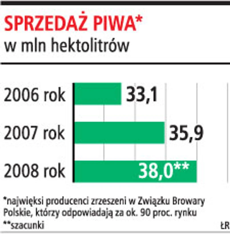 W ubiegłym roku, według Związku Browary Polskie, producenci piwa sprzedali 35,9 mln hl piwa, z czego 35 mln na rynku krajowym. To o 8,4 proc. więcej niż w roku 2006. Jeśli pogoda będzie wciąż dopisywać, to w tym roku liczba sprzedanych hl piwa przekroczyć może 38 mln.