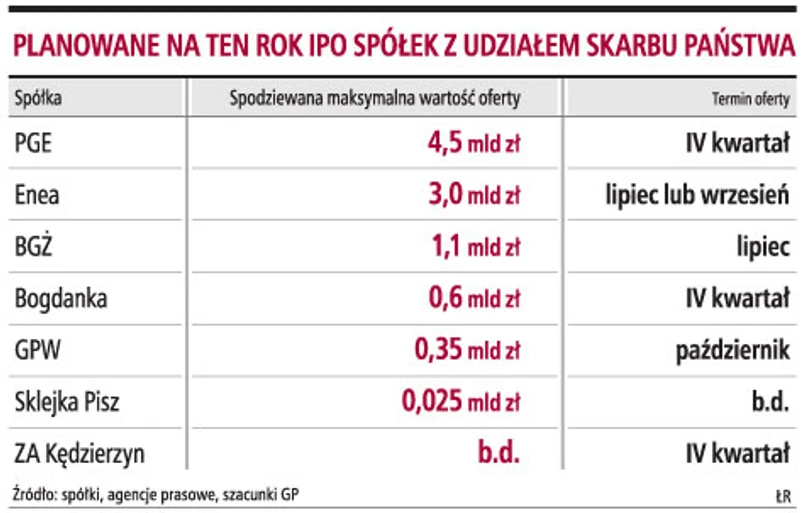 Łączna oczekiwana w tym roku wartość publicznych ofert spółek z udziałem Skarbu Państwa wynosi ponad 9 mld zł. Z dziewięciu spodziewanych IPO odbyły się dwie: zakończona fiaskiem oferta Polskiego Towarzystwa Reasekuracyjnego (PTR) oraz zakończona wczoraj IPO Zakładów Azotowych w Tarnowie.