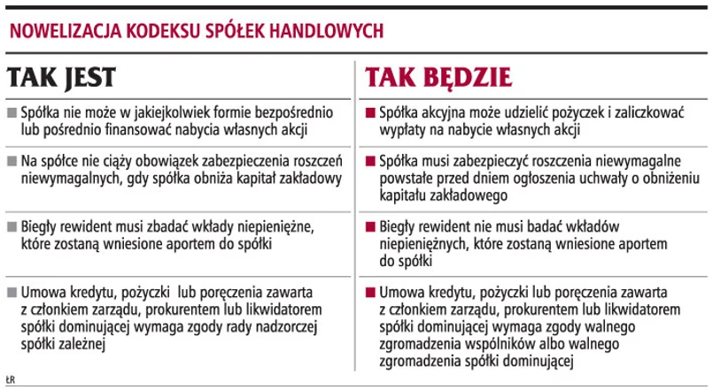 ZMIANA PRAWA - Udzielając pożyczek oraz zaliczkowych wypłat na zakup wyemitowanych przez siebie akcji, spółka łatwiej zlikwiduje bieżące nadwyżki pieniężne i przyczyni się do ustabilizowania kursu giełdowego własnych akcji.