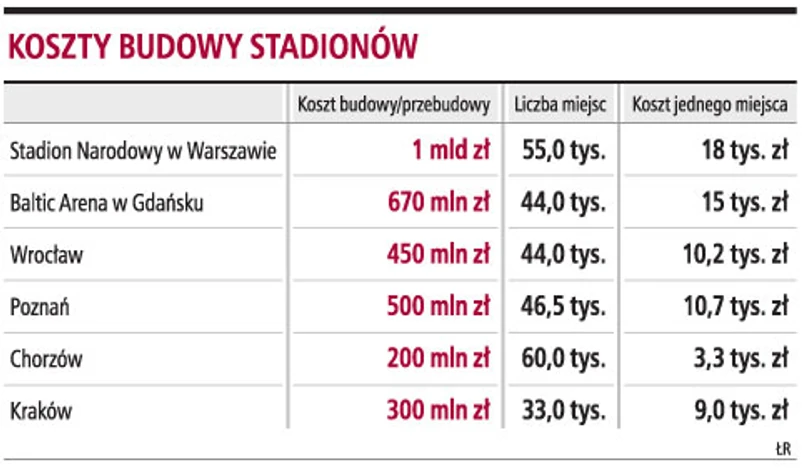 Biorąc pod uwagę koszt, jaki trzeba zainwestować, by uzyskać na stadionie jeden fotelik dla kibica, to zdecydowanie najtańszą inwestycją (3,3 tys. złotych na jedno miejsce) jest remont stadionu w Chorzowie, który do jej pory jest stadionem rezerwowym na Euro 2012. Rezerwowy jest także stadion Wisły w Krakowie, a koszt jego przebudowy szacowany jest na 9 tys. złotych na jednego kibica. Nieco drożej będzie kosztowała przebudowa stadionu w Poznaniu - ponad 10 tys. złotych na kibica. Koszty budowy nowych stadionów zawierają w sobie wszystkie prace przygotowawcze i wykup gruntów, więc z natury powinny być wyższe. Z nowych stadionów, które mają być od podstaw wybudowane na Euro 2012, najmniej zapłacimy za obiekt we Wrocławiu - około 10 tys. złotych na kibica. W Gdańsku ten koszt szacowany jest na ponad 15 tys. złotych. Warszawa jest najdroższa - ponad 18 tys. złotych na jedno miejsce.