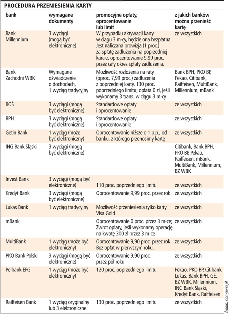 Uproszczonej procedury przeniesienia karty nie oferuje Bank BGŻ, Citibank, Dominet Bank, Eurobank, Fortis, GE Money, Nordea i Pekao.