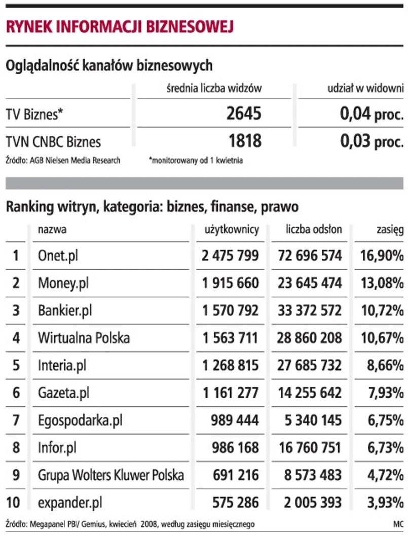 Osiem najpopularniejszych internetowych serwisów poświęconych biznesowi, inwestowaniu i prawu ma w sumie około 10 mln użytkowników - wynika z rankingu serwisów tematycznych MegapanelPBI/ Gemius w kategorii biznes, finanse, prawo. Dwa całodobowe telewizyjne kanały biznesowe - TV Biznes i TVN CNBC Biznes - ogląda natomiast średnio około 4,5 tys. widzów, a ich udział w rynku nie sięga nawet 1 proc., wynika z danych AGB Nielsen Media Research.