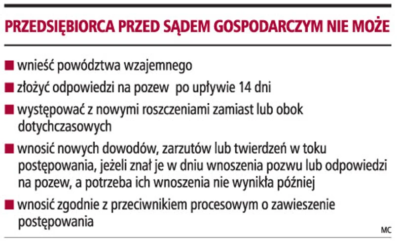 - Sprawy gospodarcze rozpoznawane są według odrębnego postępowania. Jest ono bardziej restrykcyjne dla stron niż ogólne przepisy procedury cywilnej - tłumaczy radca prawny Piotr Olczyk z kancelarii Olczyk & Kubicki.