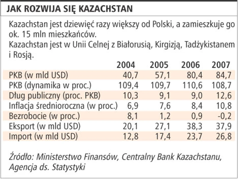 - Możemy sprzedawać tam nie tylko materiały budowlane, ale także nawozy, maszyny i artykuły spożywcze - mówi dr Andrzej Polaczkiewicz z Polskiego Towarzystwa Ekonomicznego. Polscy przedsiębiorcy obawiają się jednak rynku kazachstańskiego ze względu na odległość (dzieli nas od niego ok. 3 tys. km) oraz problemy związane z tamtejszą korupcją i biurokracją. Tymczasem zdaniem przedsiębiorców, którzy od lat są obecni w Kazachstanie, przepisy prawne i działalność urzędów nie stanowią zbyt dużego problemu.
