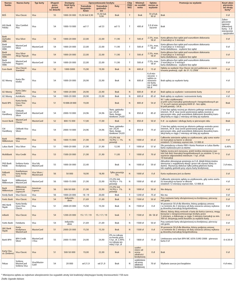 W przypadku karty kredytowej co miesiąc konieczne jest spłacenie tylko niewielkiej części kredytu (tzw. spłaty minimalnej). Wynosi ona najczęściej 2-3 proc. sumy zaciągniętego kredytu, nie mniej niż 20-50 zł (zależnie od karty i banku). Warto jednak pamiętać, że jeśli co miesiąc spłacamy jedynie kwotę minimalną, spłata całego kredytu potrwa kilka lat. Kwota spłaty minimalnej jest bowiem tak dobrana, by pokrywała odsetki od kredytu i niewielką kwotę kapitału. Dzięki temu, że klient spłaca odsetki, banki nie mają problemu z zakazanym przez prawo pobieraniem odsetek od odsetek. Dlatego, aby szybko spłacić zadłużenie na karcie, należy zdecydować się na comiesięczną spłatę kwoty wyższej niż spłata minimalna. Oprocentowanie kredytu na karcie waha się od 9,9 proc. w BOŚ do 29 proc. w Pekao.