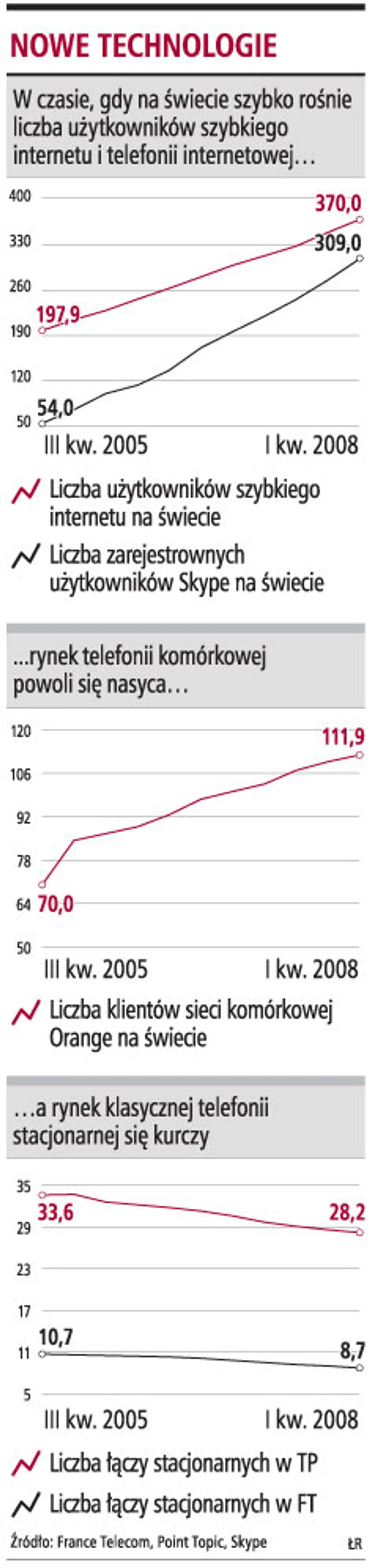 Przez kilka lat panaceum na zapaść telefonii stacjonarnej wydawał się internet. Dziś nie jest to takie pewne. Tempo wzrostu liczby szybkich łączy internetowych nadal jest wysokie, ale powoli się zmniejsza, a na dodatek spadają ceny takich usług. Rośnie też konkurencja: internet dostarczają także telewizje kablowe i sieci komórkowe. Przy okazji szybki internet jest bramą umożliwiającą oferowanie usług konkurencyjnych do telefonii głosowej stacjonarnej i mobilnej.