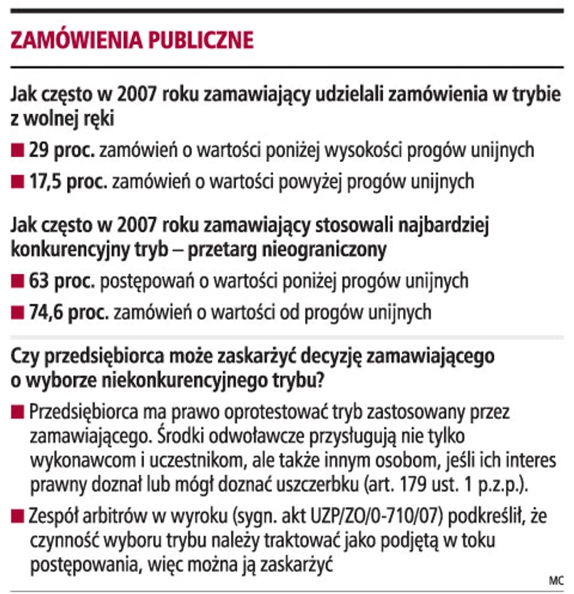 W 2007 r. udział zamówień udzielanych w trybie z wolnej ręki w przypadku mniejszych kontraktów wzrósł do 29 proc. (w latach 2005-2006 - ok. 25 proc.). Równie chętnie na wolną rękę decydowali się zamawiający przy większych zamówieniach o wartości powyżej progów unijnych (17,5 proc.).