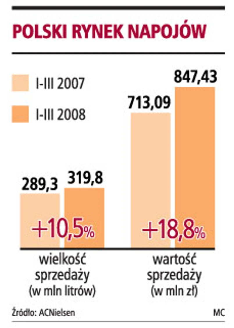 Dlatego aż 60-70 proc. całkowitej sprzedaży przypada na marki oferowane przez polskich dostawców - Maspex, Hortex i Agros Nova. Rynek soków i napojów w Polsce rośnie w ostatnich latach w tempie kilkunastu procent rocznie. Stanisław Ślubowski przewiduje, że dwucyfrowe tempo wzrostu utrzyma się w ciągu kilku najbliższych lat.