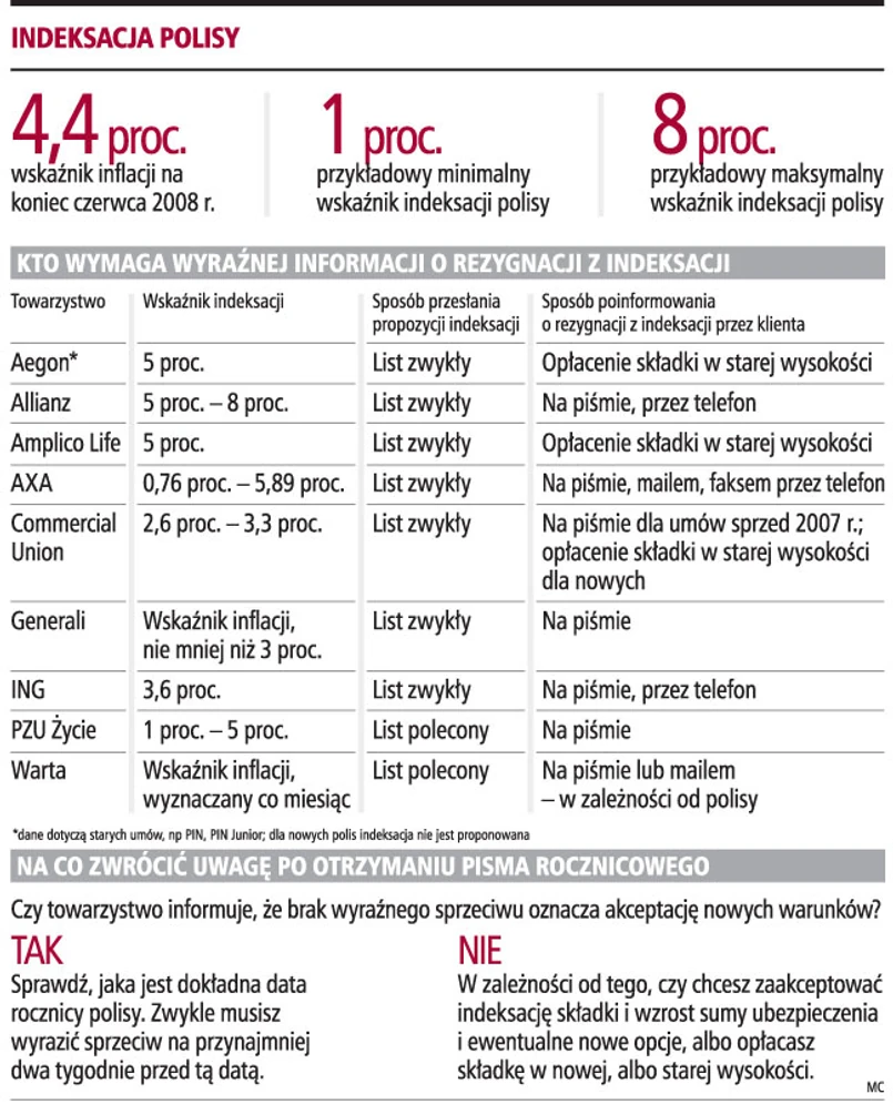 Co roku około 12 mln posiadaczy polis indywidualnych dostaje od swoich ubezpieczycieli listy z propozycją indeksacji, czyli podwyżki składki, a co za tym idzie - również sumy ubezpieczenia. Z jednej strony, to korzystne dla klientów rozwiązanie, bo chroni przed utratą realnej wartości takiej polisy: 100 tys. zł na umowie zawartej w 1995 roku ma inną wartość niż 100 tys. zł wypłaconych w razie śmierci np. w 2015 roku. Ci, którzy jednak chcą od czasu do czasu podnieść składkę lub sumę ubezpieczenia, powinni sprawdzić, czy np. po trzech odmowach z rzędu nie tracą prawa do indeksacji, bo takie zapisy są spotykane na rynku.