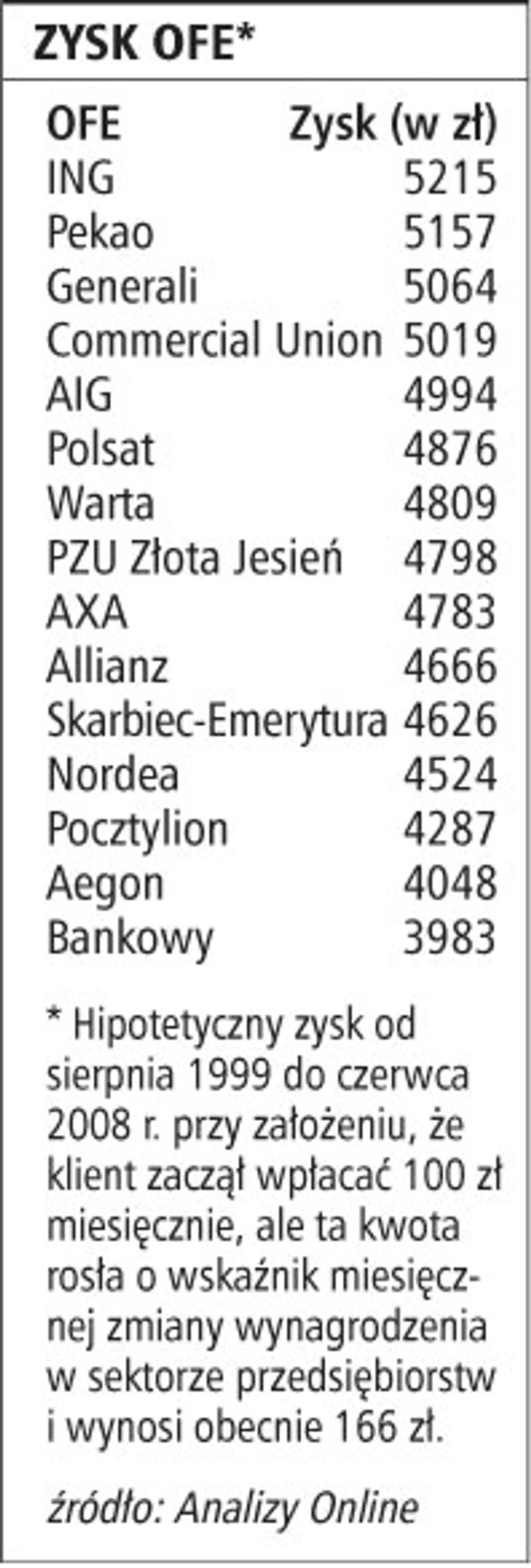 Tylko przez ostatnie trzy miesiące przeciętny hipotetyczny posiadacz konta w OFE stracił 4,6 proc. swojego kapitału (wpłaty plus zyski), czyli 897 zł - wynika z porównania Analiz Online. To efekt spadków indeksów na GPW. Jeśli weźmiemy pod uwagę tylko zysk wypracowany od początku działalności OFE, straty będą jeszcze bardziej dotkliwe. Najbardziej odczuli je członkowie OFE Polsat, który od sierpnia 1999 r. do końca czerwca 2008 r. wypracował dla hipotetycznego przeciętnego klienta 4876 zł zysku. Po I kwartale ta kwota była o 1,2 tys. zł wyższa. Średni hipotetyczny zysk dla wszystkich OFE wyniósł 4,7 tys. zł, a przeciętny spadek w II kwartale 897 zł.