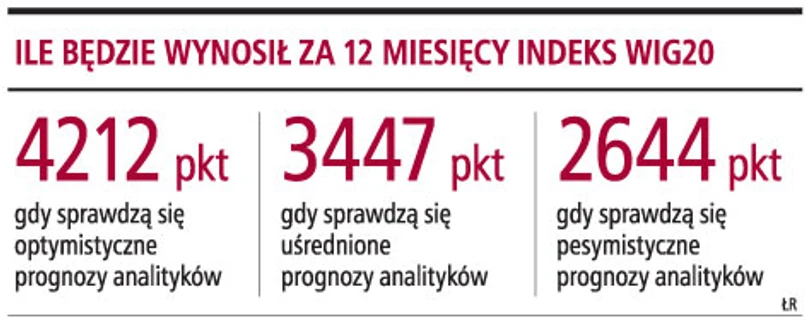 Dziś średnia wartość WIG20 za 12 miesięcy wynosi 3447 pkt. Wartość wyliczona na podstawie minimalnych dostępnych nam wycen to 2644 pkt, a wartość obliczona na podstawie wycen najwyższych to 4212 pkt.