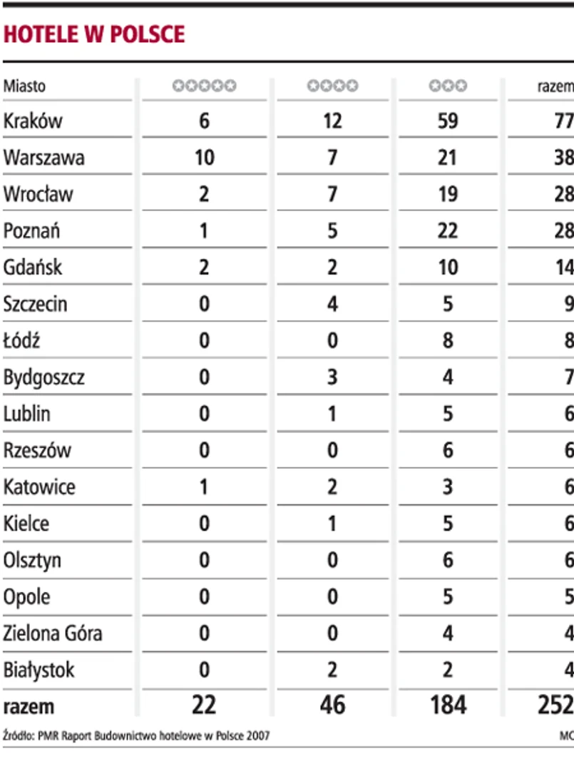 Wyjściem z tej trudnej dla deweloperów sytuacji może być przestawienie się z budowy mieszkań na budowę hoteli. W Polsce nadal brakuje miejsc noclegowych. Według raportu przygotowanego przez PMR Publications budownictwo hotelowe czekają dobre czasy. W ciągu najbliższych pięciu lat wartość tej branży będzie rosła o około 17 proc. rocznie i osiągnie poziom ponad 1 mld złotych w 2012 roku. Zdaniem wielu specjalistów Polska wciąż należy do najlepszych miejsc na tego typu inwestycje. Przyczyn jest kilka: niedoinwestowanie sektora, małe nasycenie rynku, niedostateczna liczba łóżek hotelowych, a także duży potencjał turystyczny kraju i zbliżające się Euro 2012. Według prognoz do rozpoczęcia mistrzostw Europy w piłce nożnej w Polsce powstanie około 30 tys. miejsc noclegowych w 560 hotelach. To o blisko dwa razy więcej niż w latach 2001-2006. Specjaliści z PMR przewidują, że inwestorzy skupią się przede wszystkim na obiektach jedno-, dwu- i trzygwiazdkowych. Nowa baza noclegowa potrzebna jest w Polsce nie tylko ze względu na mistrzostwa. Z roku na rok nad Wisłę przyjeżdża coraz więcej turystów. Obecnie jest to około 16 mln osób rocznie. Za pięć lat liczba ta przekroczy 20 mln.