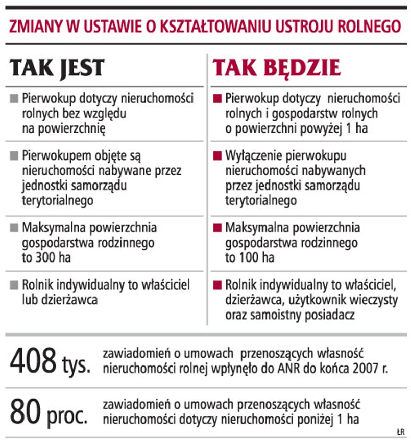 Dziś przepisy przewidują, że w przypadku gdy rolnik sprzedaje ziemię osobie nieuprawnionej z punktu widzenia ustawy o kształtowaniu ustroju rolnego, sporządzana u notariusza przedwstępna umowa warunkowa trafia do jednego z 11 oddziałów ANR. Ta ma 30 dni na skorzystanie z prawa pierwokupu. Spośród kilkudziesięciu tysięcy umów przedwstępnych, przekazywanych co roku do Agencji, 80 proc. dotyczy nieruchomości o powierzchni poniżej 1 ha. W takich przypadkach Agencja musi także przygotować odpowiedź o nieskorzystaniu z prawa pierwokupu. Według MR nowelizacja ustawy przyczyni się do mniejszego zaangażowania Agencji w czynności biurokratyczne i umożliwi przeprowadzanie szczegółowej analizy celowości korzystania z prawa pierwokupu.