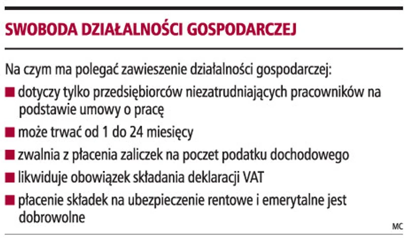 Zawieszenie działalności nastąpi na wniosek przedsiębiorcy. We wniosku trzeba podać datę, od której ma rozpocząć się zawieszenie prowadzenia działalności, oraz wskazać, jak długo ma ono trwać. Przedsiębiorca sam zdecyduje o okresie zawieszenia, jednakże nie może być on krótszy niż miesiąc i dłuższy niż 24 miesiące. Takie prawo otrzyma tylko przedsiębiorca, który nie zatrudnia pracowników na podstawie umowy o pracę.