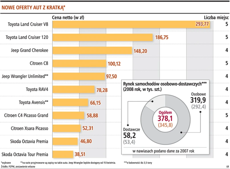 W zupełnie innym przedziale cenowym są auta z kratką Toyoty, w którym na razie najtańszym modelem jest Avensis. W kwietniu ma pojawić się w salonach Toyota Verso, czyli siedmioosobowy van. Najprawdopodobniej on również będzie miał homologację auta ciężarowego, ale wtedy będzie nim mogło jeździć tylko pięć osób. Podobnie jest np. w przypadku Citroena C4 Grand Picasso, który w wersji osobowej może przewozić sześciu pasażerów i kierowcę, a w wersji ciężarowej pasażerów można przewozić już tylko czterech. W praktyce to i tak doby wynik w przypadku tych aut, bo w większości aut, które mogą normalnie przewozić pięć osób, wersje ciężarowe dostają homologację tylko na cztery osoby. Dla klientów, którzy chcieliby wykorzystywać takie auto jako pojazd rodzinny, to istotne ograniczenie.