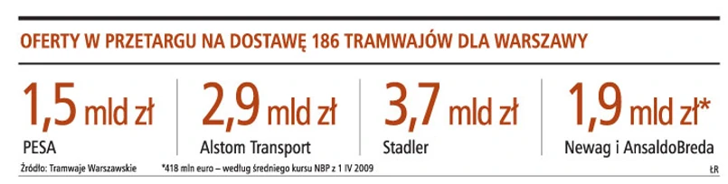 Zwycięstwo dostawcy m.in. 15 tramwajów jeżdżących już po stolicy oraz 30 pociągów elektrycznych dla włoskich miast Bari i Mediolanu nie było niespodzianką. Po otwarciu kopert z cenami okazało się, że PESA złożyła najniższą ofertę. Propozycja bydgoskiej spółki - 1,5 mld zł - została ujawniona jako pierwsza. Wszystkie kolejne były wyższe. Tymczasem władze Warszawy przeznaczyły na inwestycję 1,8 mld zł.
