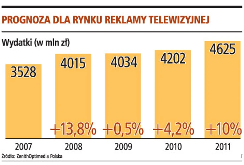 Nadawcy są już pewni, że ten rok będzie bardzo trudny, a wydatki reklamowe spadną lub - w najlepszym wypadku - utrzymają się na ubiegłorocznym poziomie. Potwierdzają to prognozy analityków domu mediowego ZenithOptimedia Polska, którzy szacują, że w samej telewizji wydatki w tym roku wzrosną o 0,5 proc. Ale w roku przyszłym zwiększą się już o 4,2 proc., a w 2011 - o 10 proc. W porównaniu z innymi mediami, gdzie wydatki się realnie zmniejszą nawet o kilkanaście procent i szybko nie odbiją, telewizje są w sytuacji idealnej.